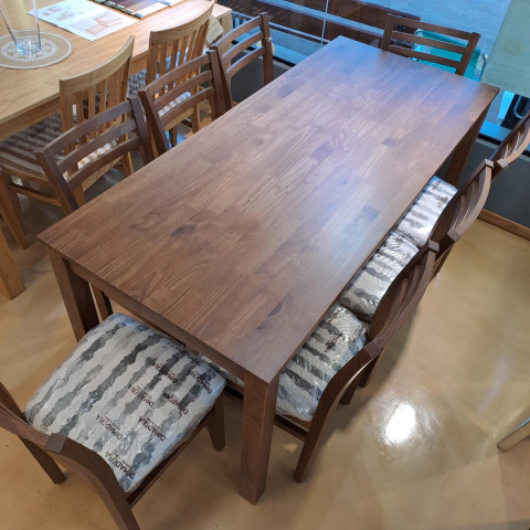 El combo JEROKY se realiza en pino macizo con distintos lustre y está compuesto por 8 sillas Nesh tapizadas en tela + Mesa kunumi 80 x 180.