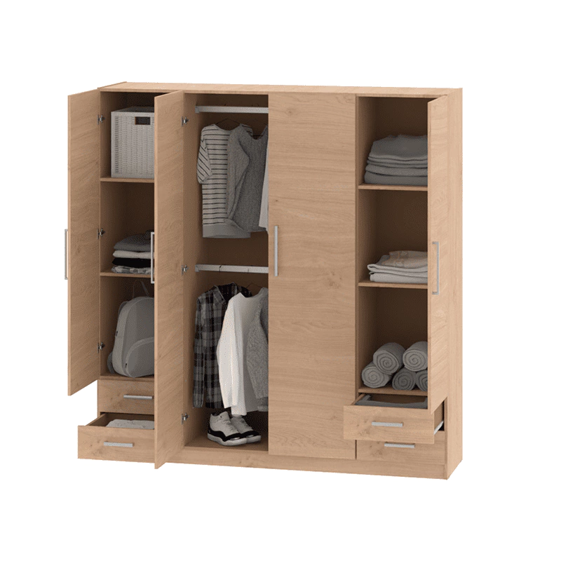 El mismo cuenta con cuatro cajones, cuatro estantes y en las dos puertas centrales, cuenta con perchero para colgar ropa o accesorios.