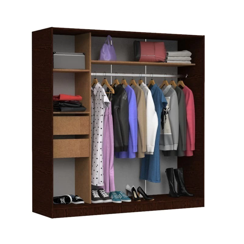 Este placard está compuesto por dos puertas correderas y en su interior cuenta con estantes, cajones internos y un amplio perchero.