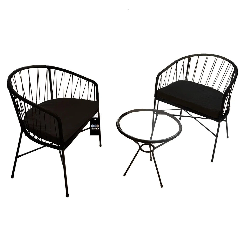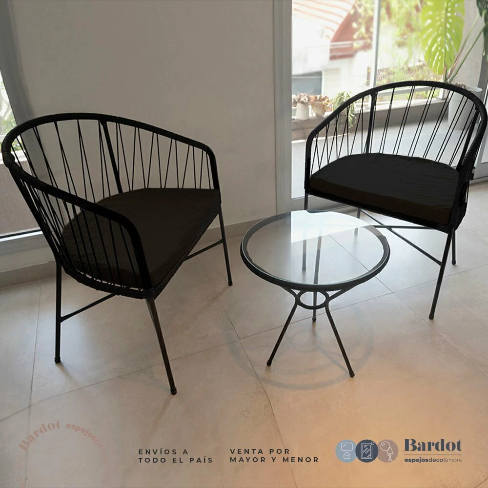 Estructura de Hierro con Pintura Anti Oxido Negra. Mesa Circular con Vidrio Incluido de 4mm. Cada Sillón Soporta hasta 140k. Patas Equipadas con Regatones Antideslizantes para Evitar Rayaduras en el Piso. Medidas Sillón: Altura Total 80cm. Ancho Total 63cm. Profundidad 44cm. Altura del Asiento desde el Piso 40cm. Medidas Mesa: Alto 45cm. Diámetro 46cm. Almohadones de Tela Tusor con Relleno de Goma Espuma Desmontable.